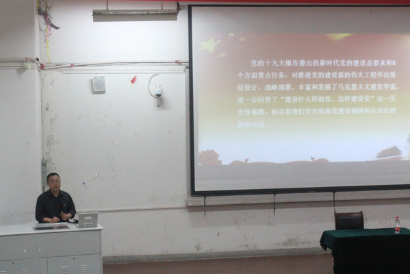 他首先向学员们介绍了党的十九大的主要内容,并重点提到党的性质:中国共产党是中国工人阶级的先锋队,代表最广大人民的根本利益,党的最高理想和最终目标是实现共产主义。党领导和团结全国各族人民,以经济建设为中心,坚持四项基本原则,坚持改革开放,自力更生,艰苦创业,为把我国建设成富强民主和谐文明和谐美丽的社会主义现代化强国而奋斗,并坚持维护以习近平同志为核心的党中央权威和集权统一。随后,老师又从我国推进新的伟大工程建设新时代中国共产党这方面谈起,其中包含先进性建设,纯洁性建设以及长期执政能力建设;并指出十八大以来,政治建设具有丰富的新内涵,政治建设包括政治信仰、政治方向、政治道路、政治原则、政治纪律、政治规矩等。中国共产党正逐步加强和规范党内政治生活,增强党内政治生活和政治性、时代性、原则性、战斗性,发展积极健康的党内政治文化,营造风清气正的良好政治生活。