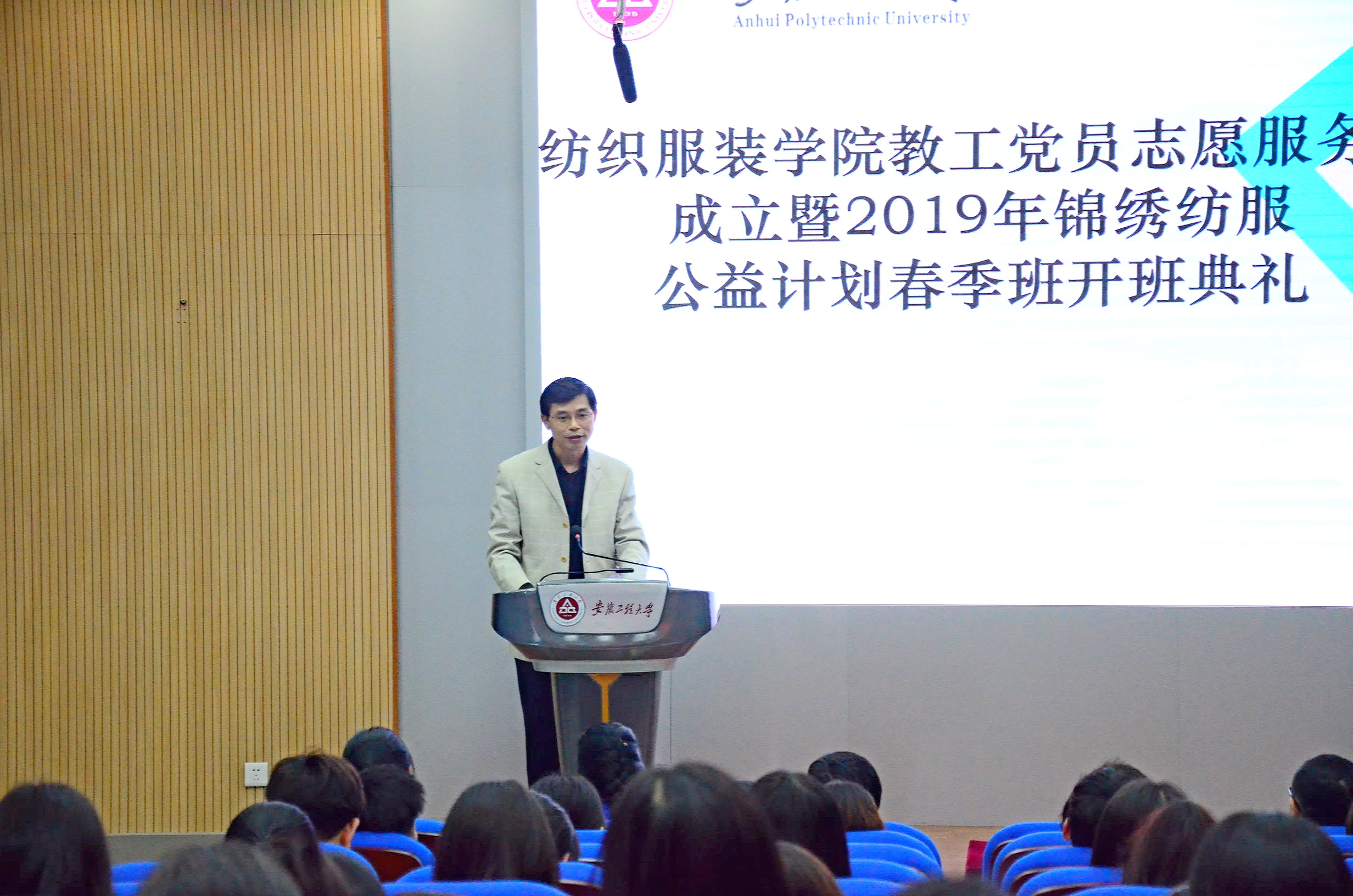 58日下午,纺织服装学院在5117教室举行教工党员志愿服务队成立暨 “‘锦绣纺服’助力青年能力提升公益计划” 2019年春季班开班典礼。校党委职能部门有关负责人、学院有关领导以及教工党支部书记、教工党员代表、培训班全体学员等出席。