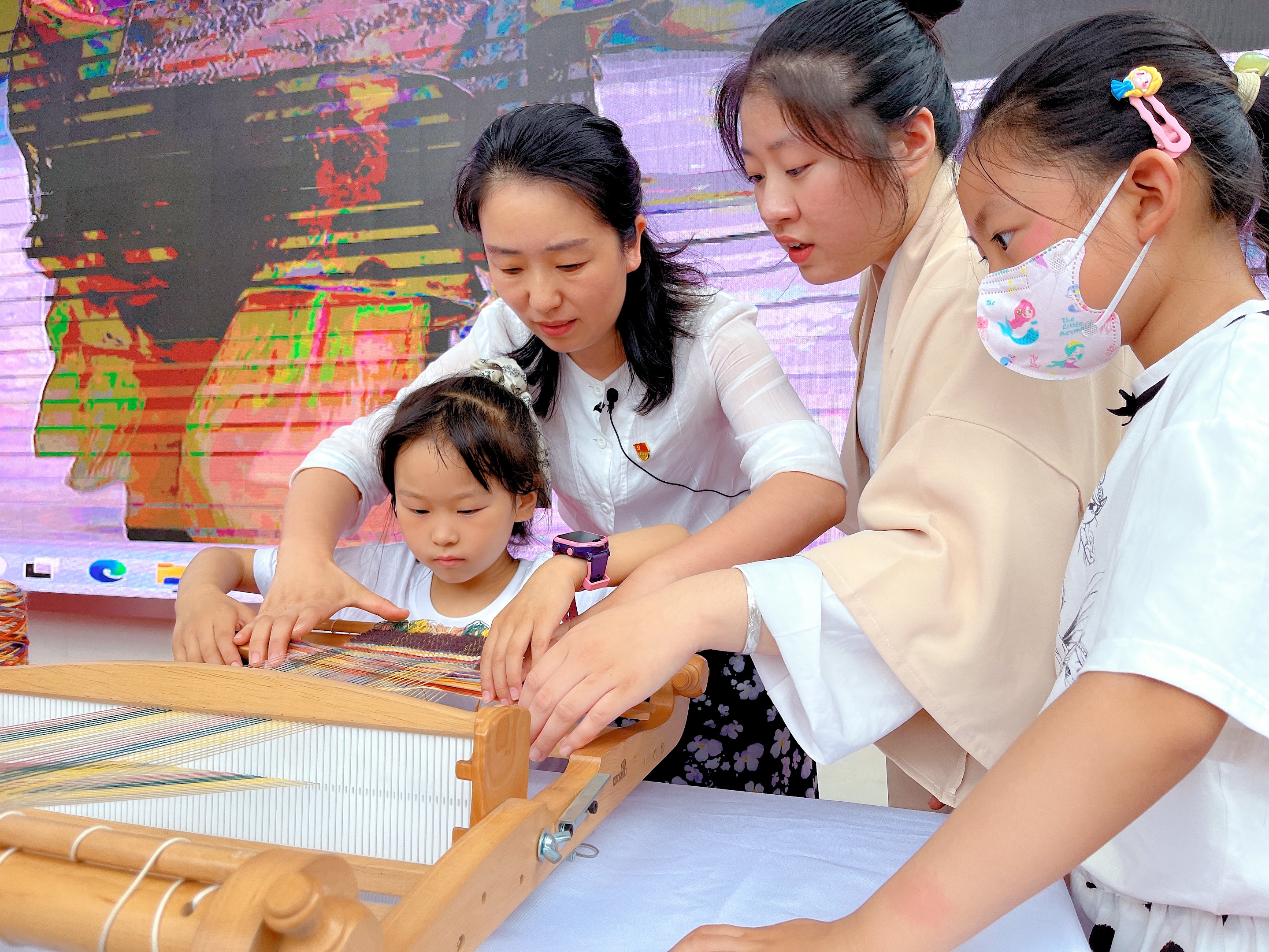 随后,李敏指导孩子们现场动手编制简易花篮,体会经纬交织的奥秘,体验实践创新之乐,进一步培养青少年脚踏实地、精益求精勇于创新的精神。期间学生志愿者身着宇航服来到现场,给孩子们讲解神州十六号纺织品,与孩子们一起热议神舟十六号成功发射,专业知识与时政融合,进一步强化孩子们对“大纺织”的认识,激发孩子们崇尚科学、科技报国的家国情怀。