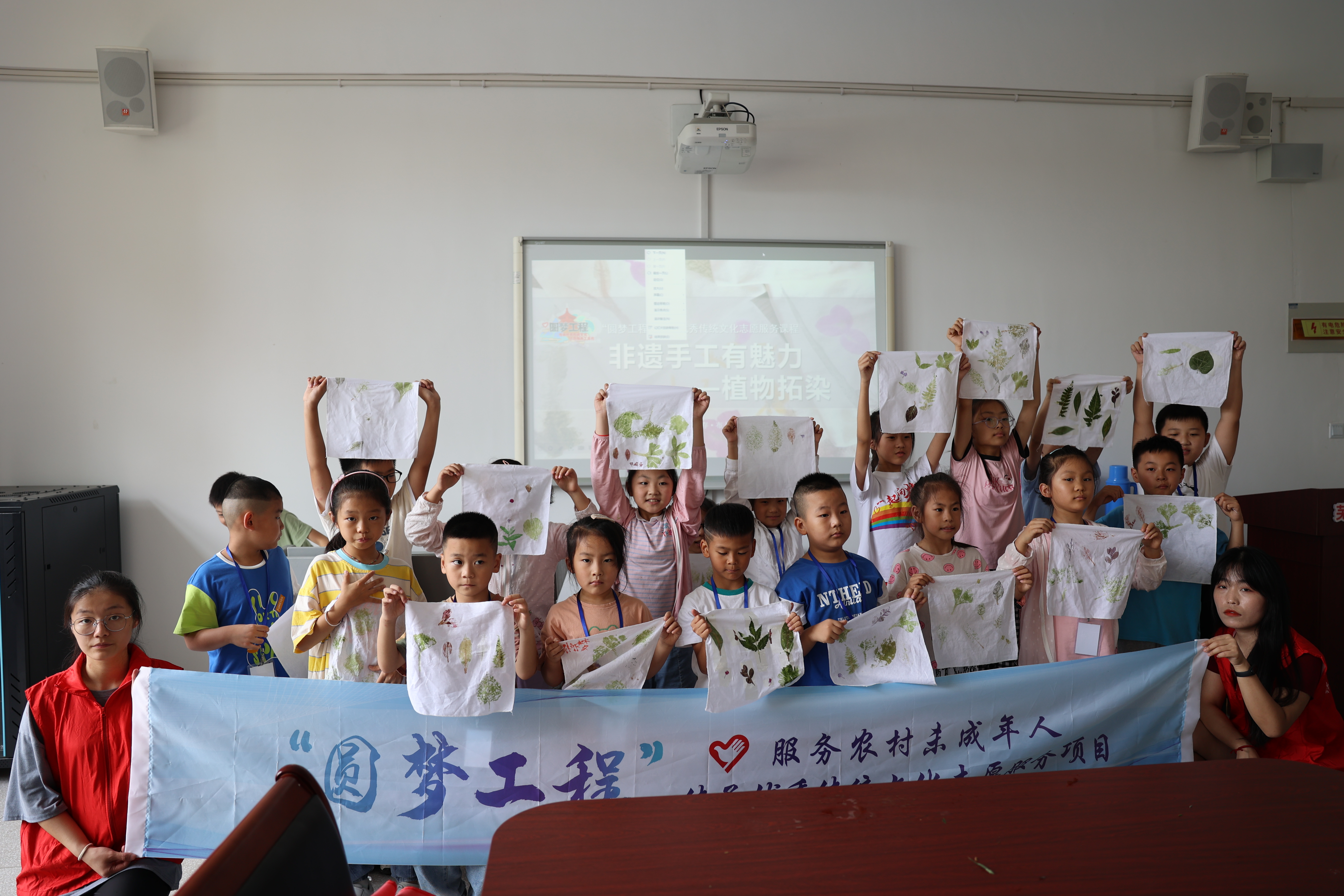 枝叶交错,纹理纵横交织;自然之美,传统艺术流传。活动开始前,团队成员提前收集鲜艳的花朵、各式的树叶作为创作材料,让学生们感受自然之美,用拓染的方式保存自然的印记。活动过程中,在团队成员带领下,小朋友们触摸和感受不同植物的质地和形状,认真学习如何选择适合拓染的植物以及拓染制作步骤,在对拓染有了一定的了解后开始拓染的手工体验。大家认真挑选自己喜欢的植物,充分发挥想象力设计排列布局,小心翼翼地粘贴染材,在敲敲打打的声音中,植物的脉络清晰呈现在布面上。最后作品展示环节,小朋友们举着各具特色的拓染作品,脸上洋溢着喜悦的笑容。