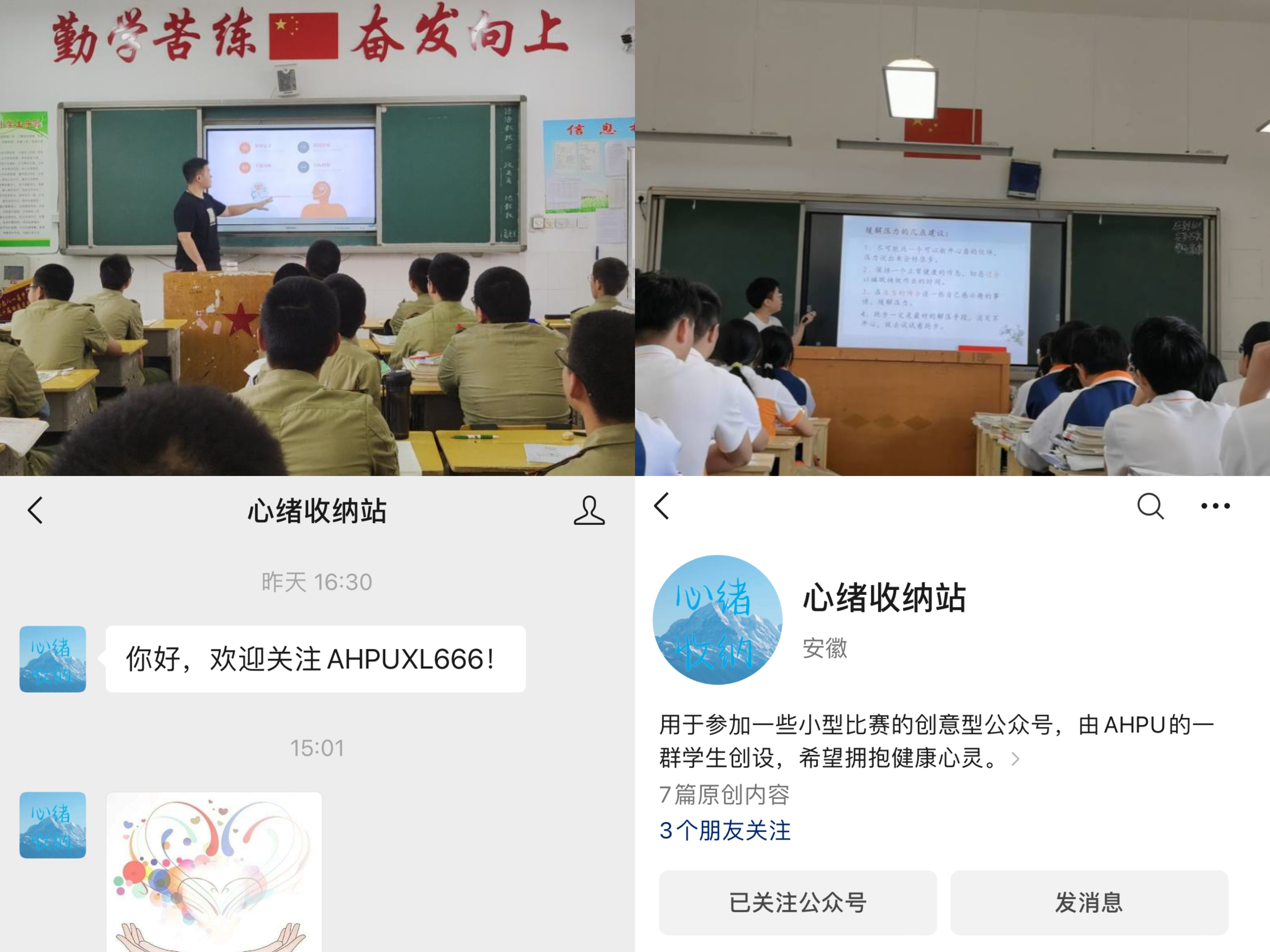 心理健康问卷调查是给青少年“心灵”的一次体检,以问观心,团队成员化身心理“治疗师”。为促进青少年心理健康发展,引导和帮助青少年正确认识自我,团队成员通过访谈、问卷、新媒体等形式开展心理健康的调研活动。其中,张鑫同学走进合肥八一中学,进行简单的问卷调查统计,通过及时的问卷反馈,帮助大家解决当下的一些心理问题,以及教导大家如何拥有更好的学习方法;朱焱琪同学走进江苏省常州市武进区横山桥高级中学,以高三学生的经历,从心理问题出现的角度分析压力大的原因,并提出五种合适的解决方案,对高三学生的心理问题“对症下药”,开出心理健康“诊断方”。此外,为扩大活动影响力,让更多的人了解心理健康知识,团队创建“心绪收纳站”微信公众号,先后发布多篇推文,并开通后台留言功能和邮箱留言方式,累计受到500余人关注。