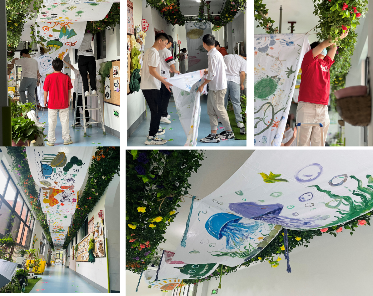 经过一周的协作,志愿者团队同孩子们一起完成了全部创作。作品被悬挂在幼儿园走廊天花板上,富有童真童趣的绘画,装点着校园,传递着美好,温润着心灵。