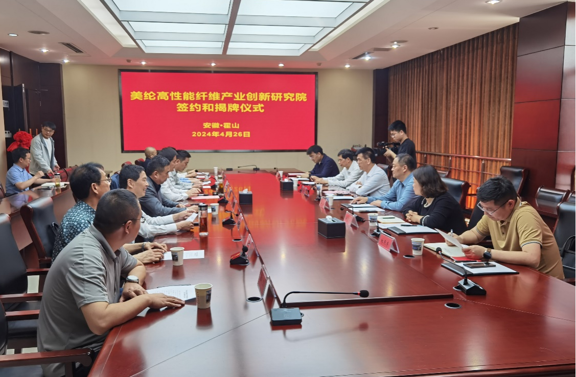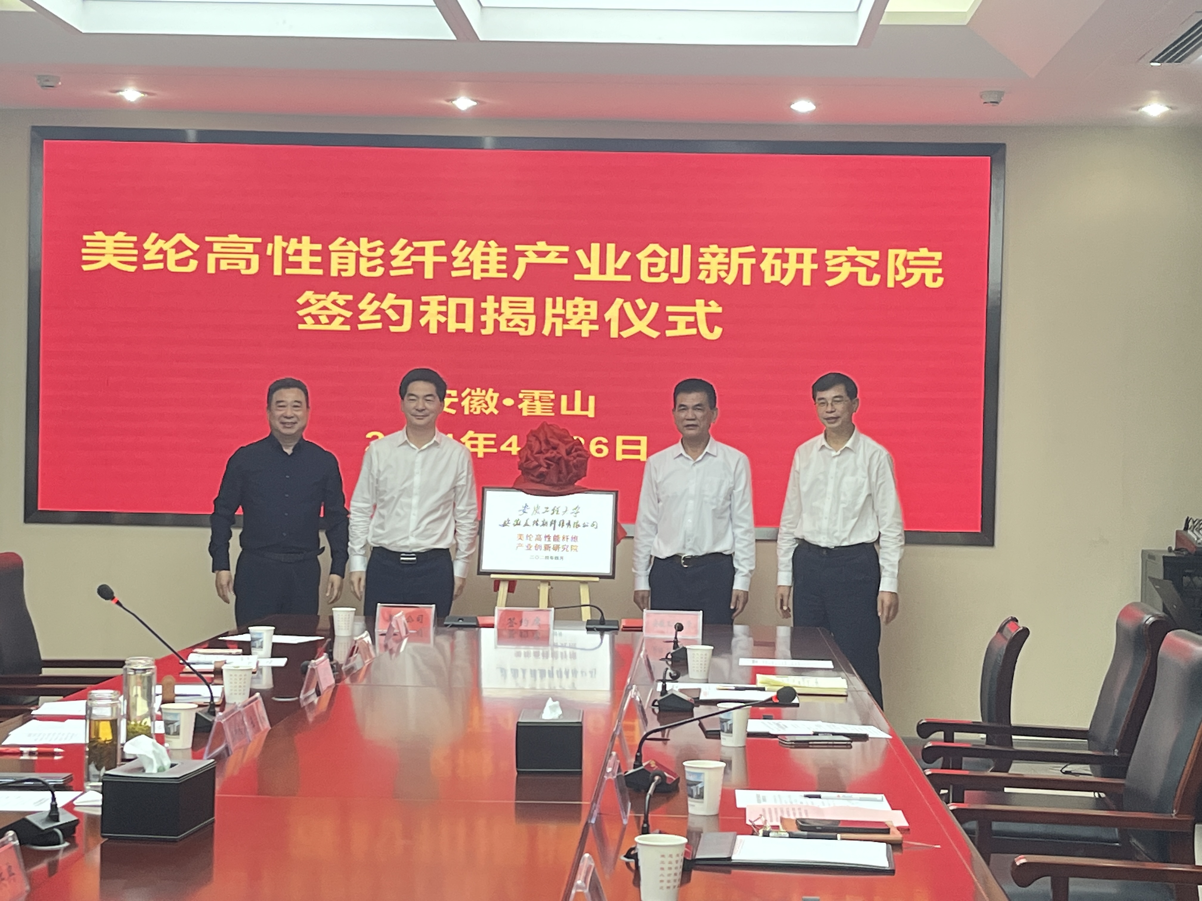 为深化校企产学研合作,深入推进校企融合,4月26日,学校与安徽美纶新纤维有限公司共建的“美纶高性能纤维产业创新研究院”签约暨揭牌仪式在霍山县举行。校党委副书记、校长卢平,校党委常委、组织部部长王弘,霍山县县委副书记、县长罗文,安徽美纶总经理程洪典出席揭牌仪式。霍山县有关部门负责人、学校相关职能部门及纺织服装学院主要负责同志,安徽美纶相关人员参加。揭牌仪式由霍山县县委常委、副县长王翔主持。