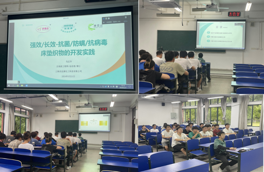 马正升博士从家纺产品的防螨/抗菌/抗病毒的必要性、防螨/抗菌/抗病毒剂的分类以及防螨/抗菌/抗病毒床垫布的开发实践三个方面介绍了目前在防螨、抗菌领域的相关印染加工技术,结合公司实际研发重点介绍了上海洁宜康化工科技有限公司在防螨、抗菌床垫织物开发的相关工作,充分开拓了同学们视野,增加了专业荣誉感。