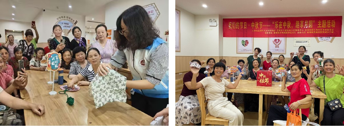 活动伊始,“花毛茛”志愿团队成员朱焱琪通过猜灯谜互动游戏形式活跃现场气氛。活动中,团队成员向老人们介绍了艾草锤的药用价值,进行艾草锤制作的演示,并指导老人们动手制作艾草锤。活动现场,大家还一起制作了手工月饼,洋溢着清新愉快的氛围。