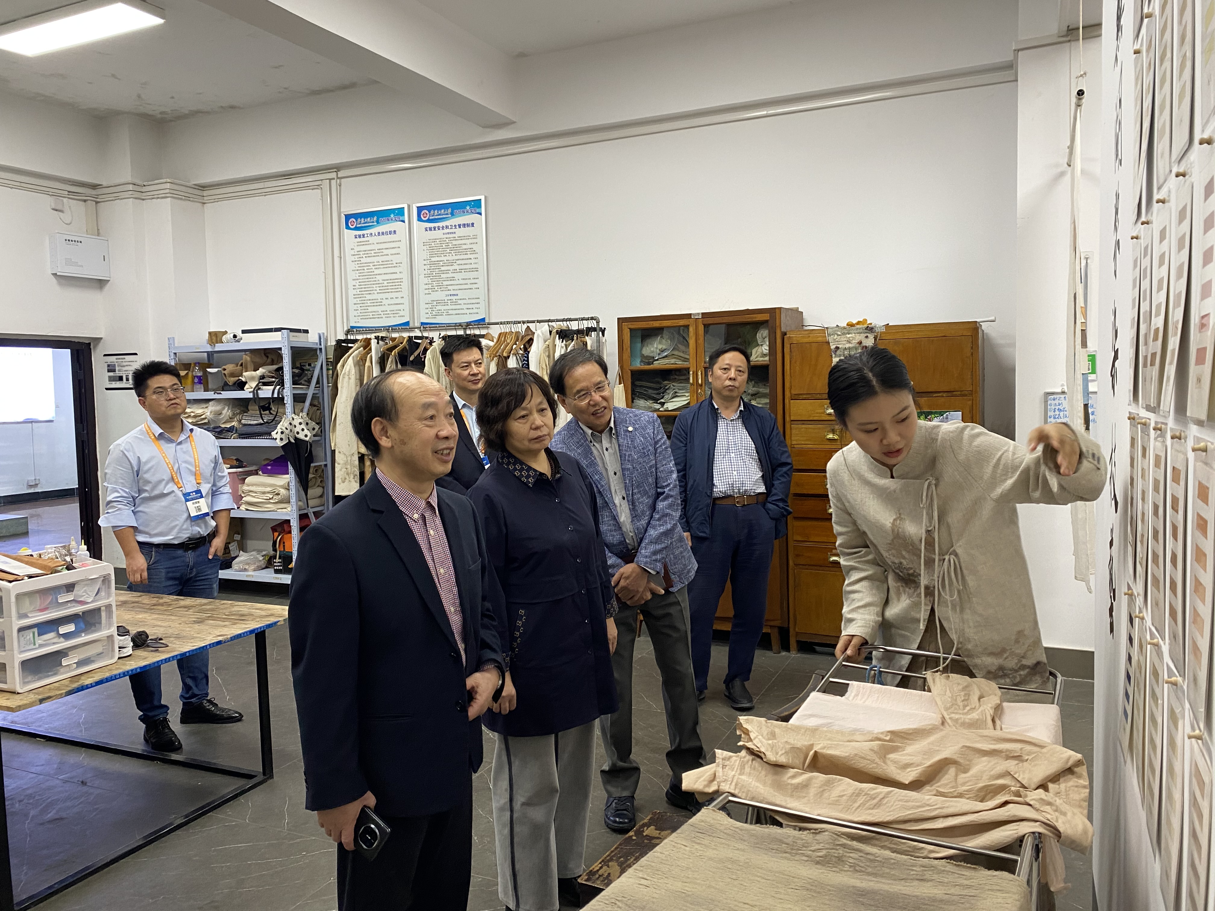 孙以泽一行参观了工程训练中心膜材料中试基地、纺织服装学院展厅和实验室,随后在纺织服装学院会议室进行了座谈交流。