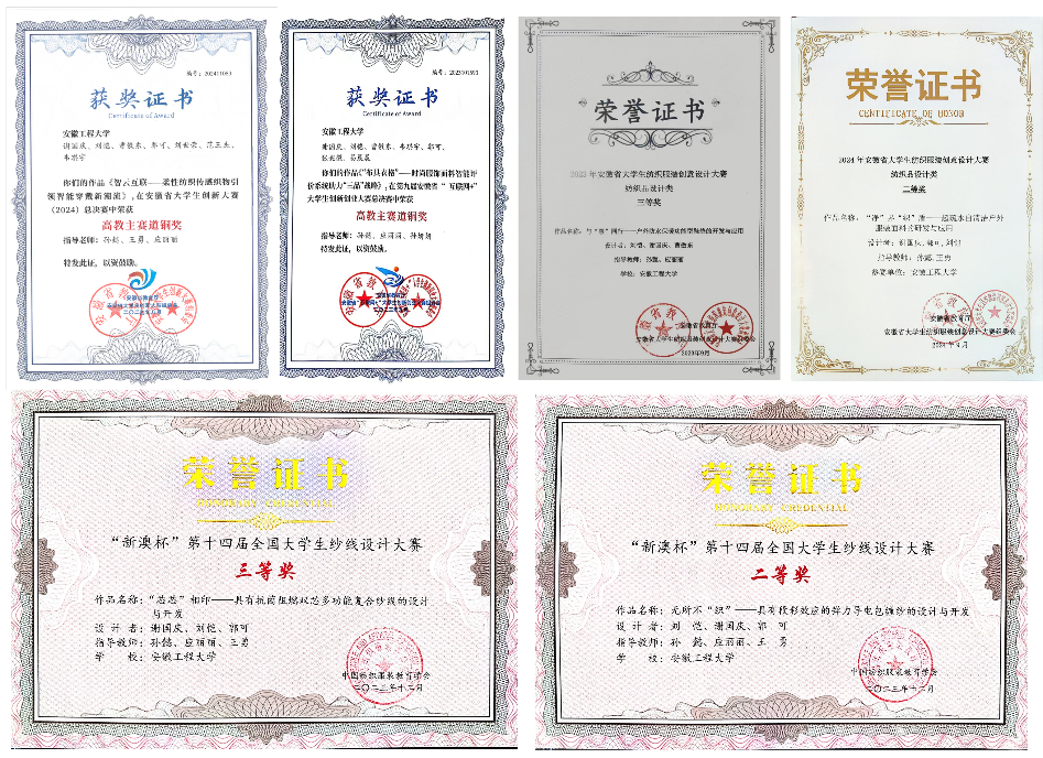 纺织工程创新实验班整合了校内外大量优质学习资源,最大限度满足学生个性化的学习需求。改革“课程教学”培养模式。创新班采用“小班化”教学,为学生提供了高质量的课程学习环境,借助学院搭建的学科平台,让学生走进实验室,走进科研,不断提升创新意识。建立“多维联动”育人机制。采用双导师制,打破“工科理科化”壁垒,校内导师负责奠定鉴定坚实的创新研究基础,校外企业导师则为学生提供个性化、多样化的学习实践机会。创造“赛教融合”育人体系。学院以学科专业竞赛和创新创业比赛为依托,致力于纺织类高素质复合型人才的塑造。通过以赛促学,提高学生对专业知识学习的积极性,增强学习的内驱力;通过以赛促教,引导学生树立正确的学习观、培育学生的责任担当意识和家国情怀;通过以赛促建,深化校企合作,促进资源共享和基地建设,实现产学研一体化推进的专业建设目标。同时以成果导向为抓手,实现赛后良性循环,利用参与竞赛过程中掌握的新观点、新成果,撰写论文、申报专利,及时将实用的竞赛成果“落地生根”。