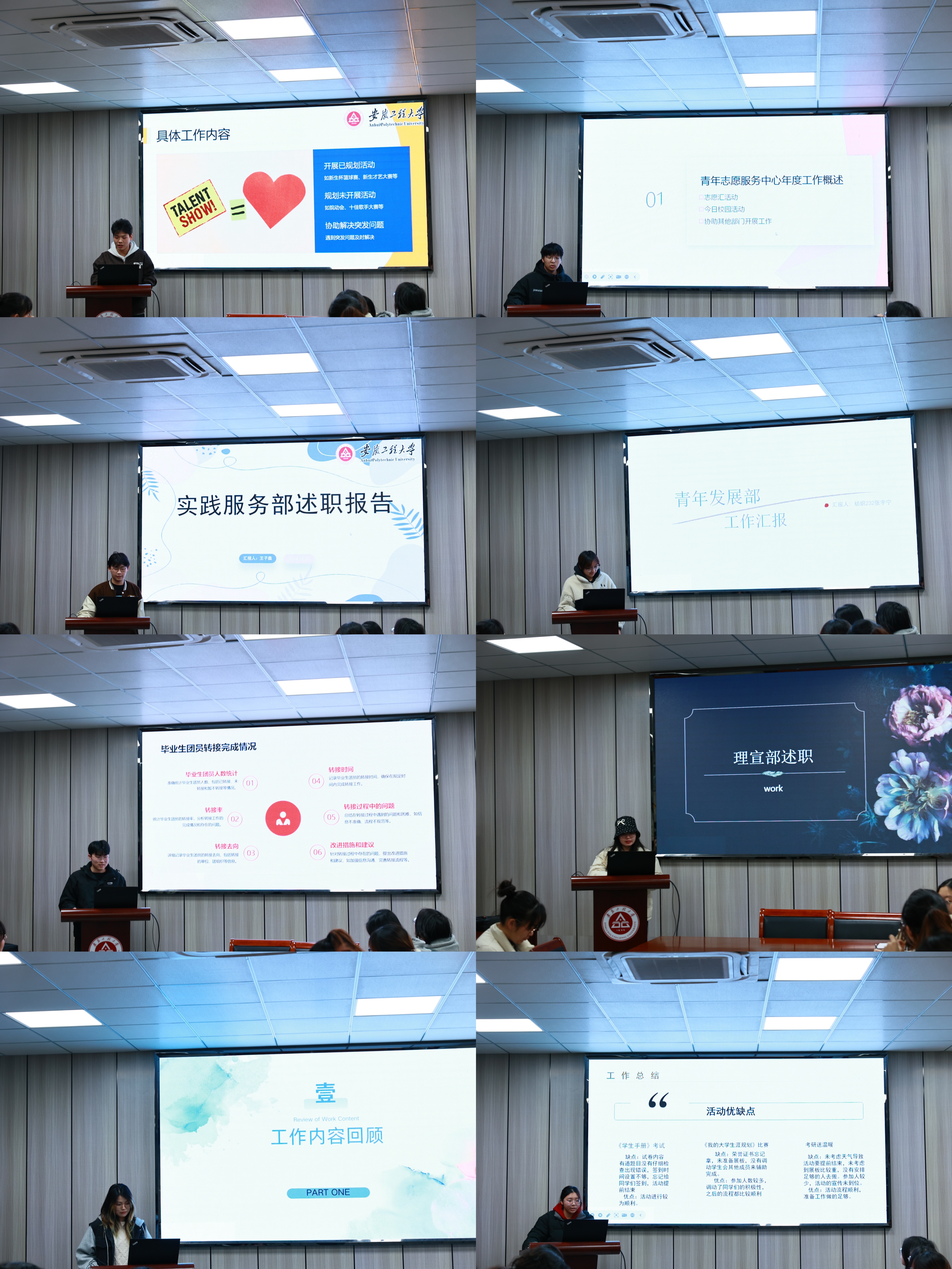 学生会各部门负责人依次对本年度开展的各项活动进行了汇报,针对活动不足进行反思与总结,提出下一步工作思路。团委、学生会负责人重点汇报本学期工作开展情况,总结工作的亮点与不足,并简要介绍下学期的工作打算。