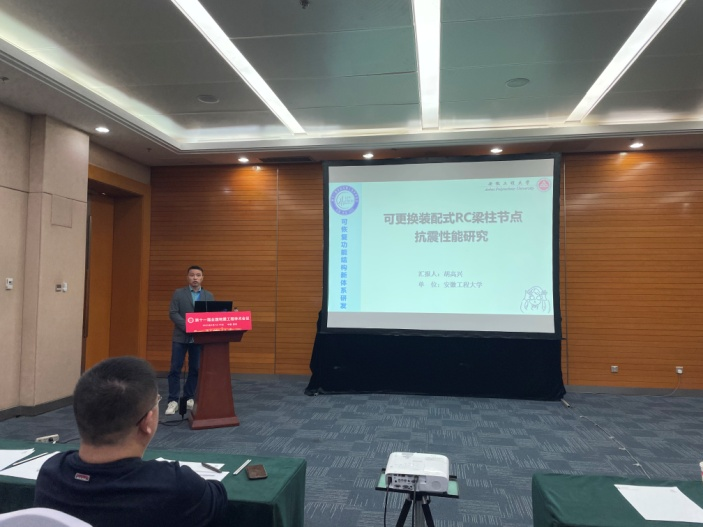 本次会议共设主会场1个、分会场9个,其中院士和专家大会报告12场、分会场报告300余场。在分会场上,我院土木工程系教师胡高兴作了题为“可更换装配式RC梁柱节点抗震性能研究”的学术报告,他主要从研究背景、可更换耗能装置力学性能研究、可更换装配式RC梁柱节点抗震性能研究、研究成果及展望4个方面进行了介绍和交流。