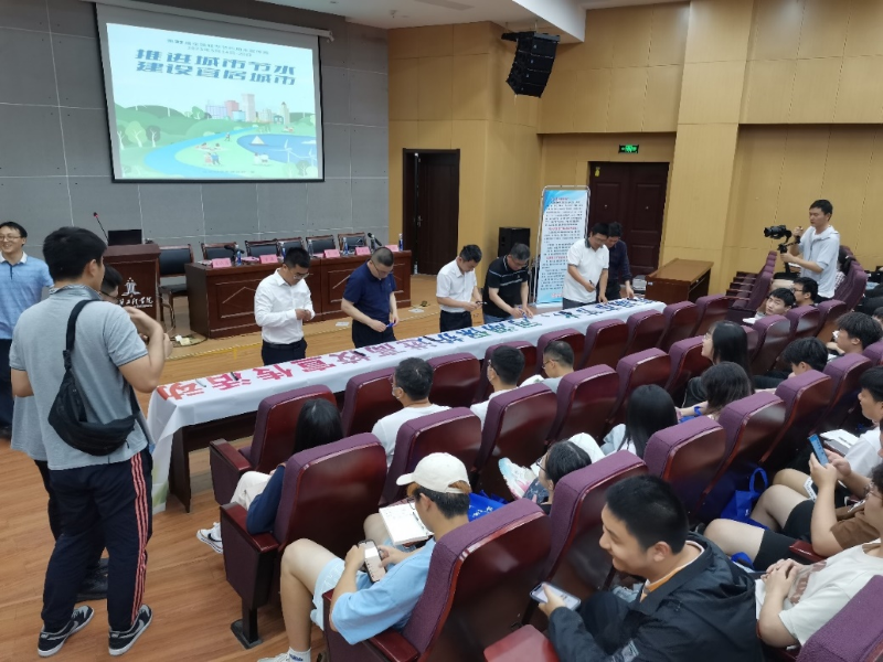 活动第一阶段,各参会代表发表讲话。丁敏生就推进城市节水,建设宜居城市发表讲话。曾磊介绍了我院给排水科学与工程专业培养高水平水行业工作者,开发推广应用节水新工艺、新技术、新器具,并对助力提高城市用水方面提出新要求和期望。姜成浩介绍了供水管网漏损检测、供水管网调度、稳压节水、自动化、信息化节水等先进技术措施。李鹏介绍了芜湖市节水工作情况,提出节水工作的未来重点发展方向。芮道宏介绍了芜湖市河湖长制工作情况,总结了芜湖市河湖长制工作面临的挑战和机遇。此外,各参会领导与全体师生在节水横幅上签字留念,号召全体师生积极参与到节水活动中。