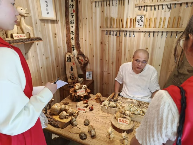 西溪南古村以独特的魅力吸引来了诸多外来人才来此创业,其中产业包含了民宿、摄影棚、文创品、咖啡店等等,助力乡村振兴,共赴富裕路,为全面建成小康社会添砖加瓦。团队成员采访了几位在此创业的群众,其中一位从吉林来到西溪南创业的雕刻师傅向团队成员们分享了自己的创业故事,他表示:“来到西溪南创业已经一年多的时间了,古村落的生活十分的安逸闲适,当地村民都很友好,西溪南是个宜居的好住处,在此创业获得了许多的帮助,也希望自己的手艺能够为西溪南的发展有所贡献。”随着西溪南的发展,来西溪南的创业者越来越多,他们用自己能力和方式,带动了西溪南古村的经济发展已经旅游业发展,为西溪南的乡村振兴注入活力。