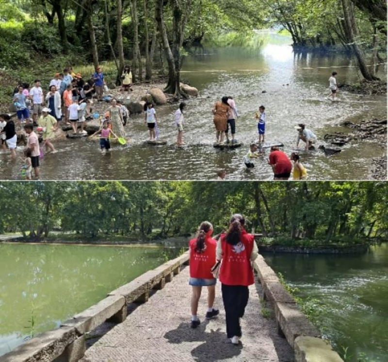 实践团队前往黄山市西溪南古村,团队成员们在当地管理人员的带领下进入古村落,实地考察了当地发展现状。西溪南古村落保持原汁原味,没有过分的景区开发,给游客带来了一种纯粹和自然的体验,古韵悠悠的村庄与清新安逸的环境成为了村落的一大亮点,被誉为“绿野仙踪”。许多人在网络上看到后被吸引而来,西溪南的植被高、村内河流与小溪众多,林间的小溪水温较低,是盛夏时节避暑的好去处,古村落内多有在林间小溪内嬉戏玩水以及打卡拍照的外来游客,这为西溪南的旅游发展带来了一大助力,不断推进乡村振兴发展。