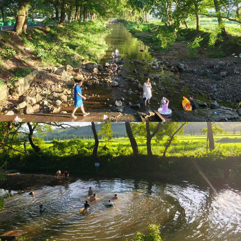 在“绿野仙踪”河道实地探访,只见两岸树木参天,枝叶交错形成天然遮阳伞,阳光透过缝隙洒在浅滩上,光影斑驳宛如童话世界。岸边小摊热闹非凡,水枪、小渔网、拖鞋等玩水装备一应俱全,烧烤香气扑鼻,不少家庭在溪中嬉戏,欢声笑语不断,团队成员切实感受到这里的火爆人气与独特魅力。