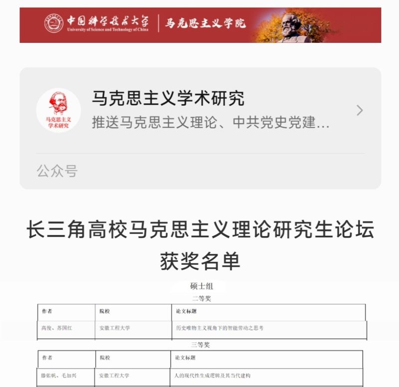 本次论坛入选论文绝大多数来自985、211等院校,有效收稿1142篇,30篇硕士研究生提交的作品入选论坛交流环节并获奖。其中,我校马克思主义学院2022级研究生高俊撰写的论文《历史唯物主义视角下的智能劳动之思考》荣获二等奖、滕佑帆撰写的《人的现代性生成逻辑及其当代建构》荣获三等奖,这也是我校提升研究生专业能力建设,增强学术交流取得的成果。高俊受邀在分论坛一会场进行主题发言,并与参会专家学者、青年硕博参会者就论文内容开展研讨。