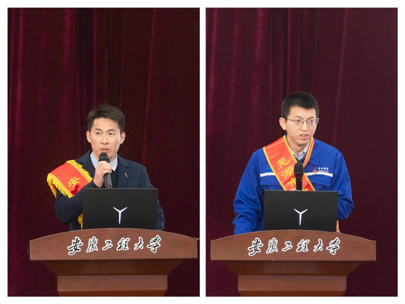 本次活动以劳模工匠深入思政课堂的形式开展,紧扣“弘扬三个精神,放飞青春梦想”的主题,和《思想道德与法治》相关章节内容,实现理论与实践的相互结合。“全国五一劳动奖章”获得者、“安徽省劳动模范”、安徽华能电缆集团有限公司技术部经理肖尚浩,“芜湖市十大杰出青年”“芜湖市五一劳动奖章”获得者、冶金博士、芜湖新兴铸管有限责任公司炼铁部副部长魏瑞瑞,以其亲身经历,为400多名大一新生讲授了一堂生动的思政大课。