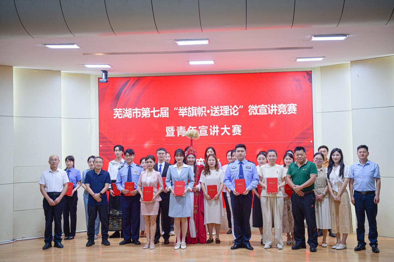 为深入学习贯彻习近平新时代中国特色社会主义思想,推动党的创新理论在青年群体中深入人心,6月27日,芜湖市第七届“举旗帜·送理论”微宣讲竞赛暨青年宣讲大赛在我校举办。本次大赛由中共芜湖市委宣传部、中共芜湖市委讲师团主办,芜湖市社会科学研究基地承办。市委宣传部常务副部长魏超、市社科联(市委讲师团)主席王建明、市社科联副主席李福东出席活动。