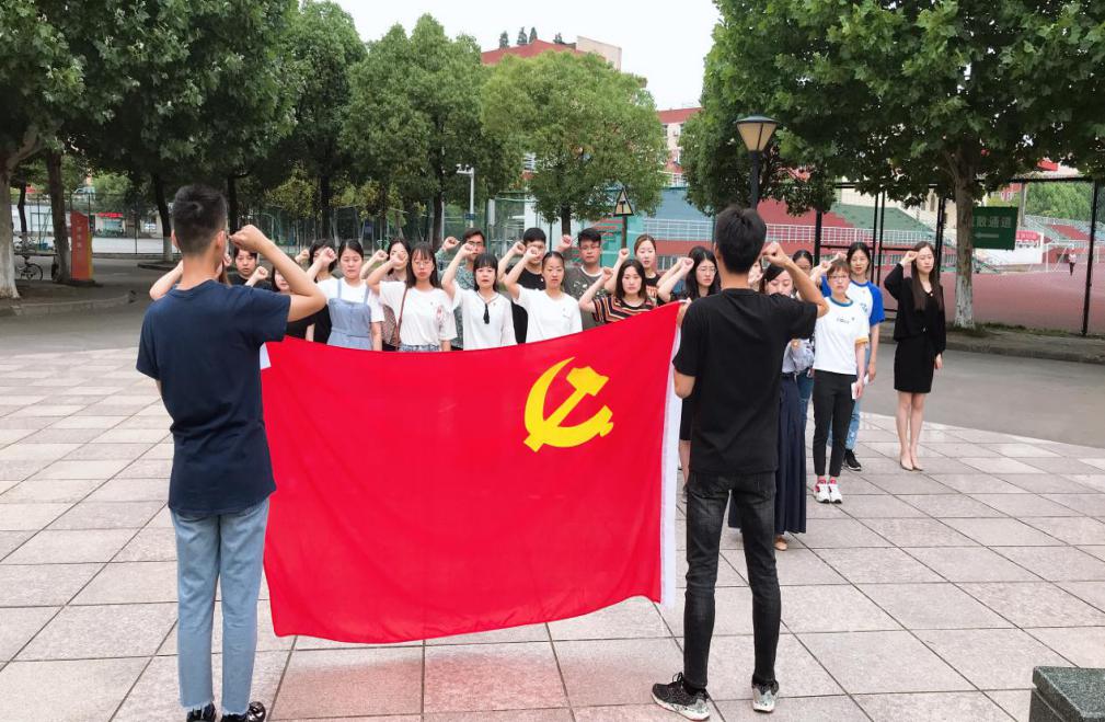 毕业生党员在支部书记刘云云的带领下,在党旗前庄严宣誓,承诺自己定会顽强奋斗,走好人生新的长征路。