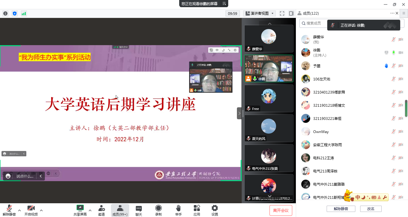 为深入学习宣传贯彻党的二十大精神,全面落实“三抓”和“三全六专”工作要求,激发学生学习英语的动力,缓解学生学习英语的迷茫、焦虑情绪。12月15日晚,外国语学院大学英语第二教师党支部线上开展了“我为师生办实事”活动。支部书记徐鹏为学生义务举办“大学英语后期学习讲座” ,支部组织委员薛爱华、大学英语教学负责人涂文婷以及公共外语120多名学生参加了讲座。