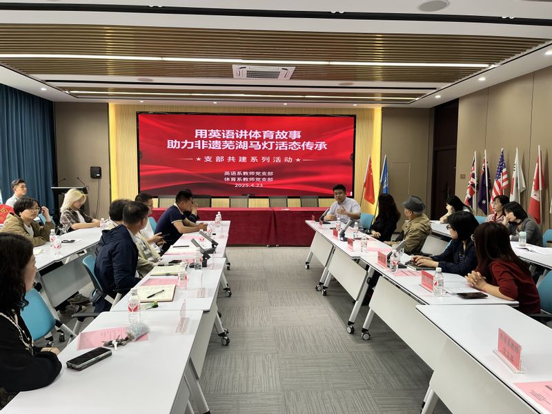 423日下午,在9209会议室,外国语学院英语系教师党支部与体育学院体育系教师党支部联合开展党支部共建活动。本次活动以“用英语讲体育故事,助力非遗芜湖马灯活态传承”为主题,旨在通过跨学科合作,探索地方特色文化的国际传播新路径,推动非遗文化的创造性转化与创新性发展。